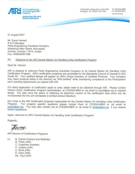 Das „Air-Conditioning, Heating, and Refrigeration Institute“ (AHRI) formuliert Industriestandards und zertifiziert Produkte. Die Zertifizierungsprogramme des AHRI bewerten die Effizienz und eine Vielzahl weiterer Produkteigenschaften von Heizungs‑, Lüftungs‑ und Klimatisierungs‑ sowie von Kälteanlagen anhand des Stands der Technik auf der Grundlage technischer Standards und Normen. Zentrallüftungsgeräte von Petra Engineering Industries Co. sind vom AHRI nach AHRI 430 zertifiziert und aufgrund dessen nach erfolgreichem Bestehen anspruchsvoller Standards für Produkteigenschaften im „AHRI Directory of Certified Product Performance“ gelistet.